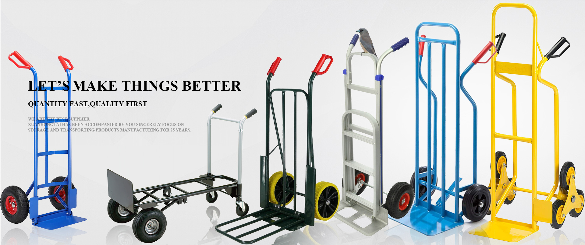 青岛宣鸿泰工业品公司是一家综合性的集设计、研发、生产制造、定制生产的业内领先者,公司工艺先进,技术力量雄厚,具备完善的质量检测手段和完善的管理体制。公司拥有丰富的产品线, 主要产品有货仓车 、工具车、拖车、货架、托盘、园林工具、脚轮、胶轮、各种轮胎、橡胶制品、塑料制品等产品,既能保证大批量定单的及时供应,又可为多品种、小批量客户专门生产。